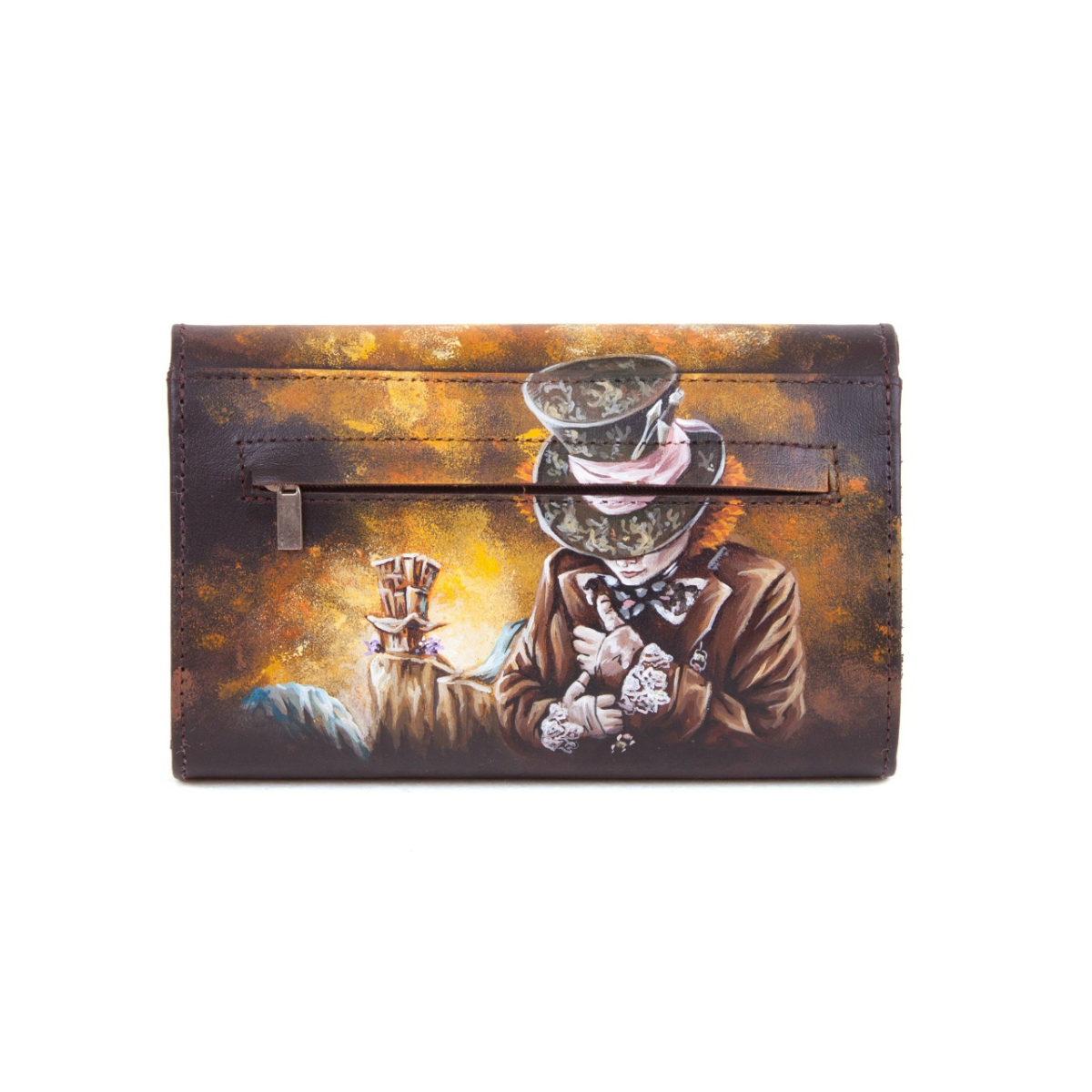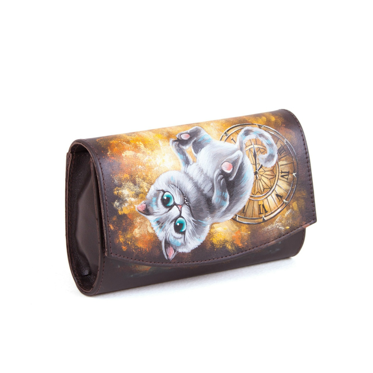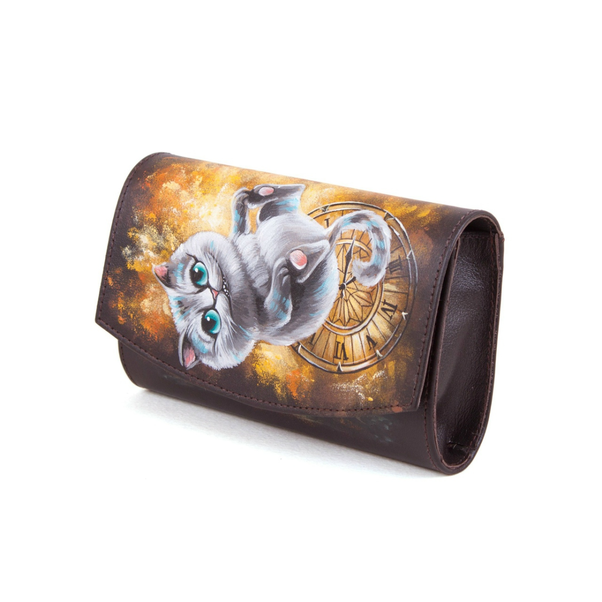 Женский кожаный кошелек на молнии с рисунком "Чешир с часами" ручной работы на заказ | Купить в Sumnizza