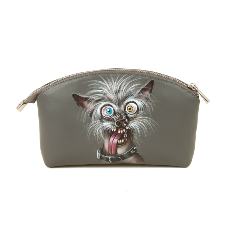 Кожаная косметичка на молнии с рисунком ручной работы на заказ "Бешеная собачка" | Купить в интернет-магазине