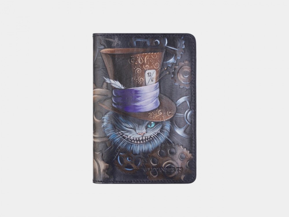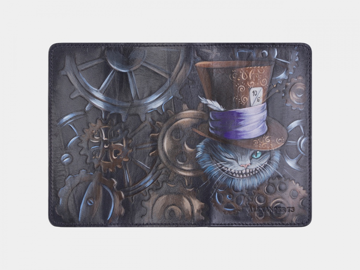 Кожаная обложка ручной работы с росписью "Чешир в цилиндре" с рисунком ручной работы на заказ | Купить
