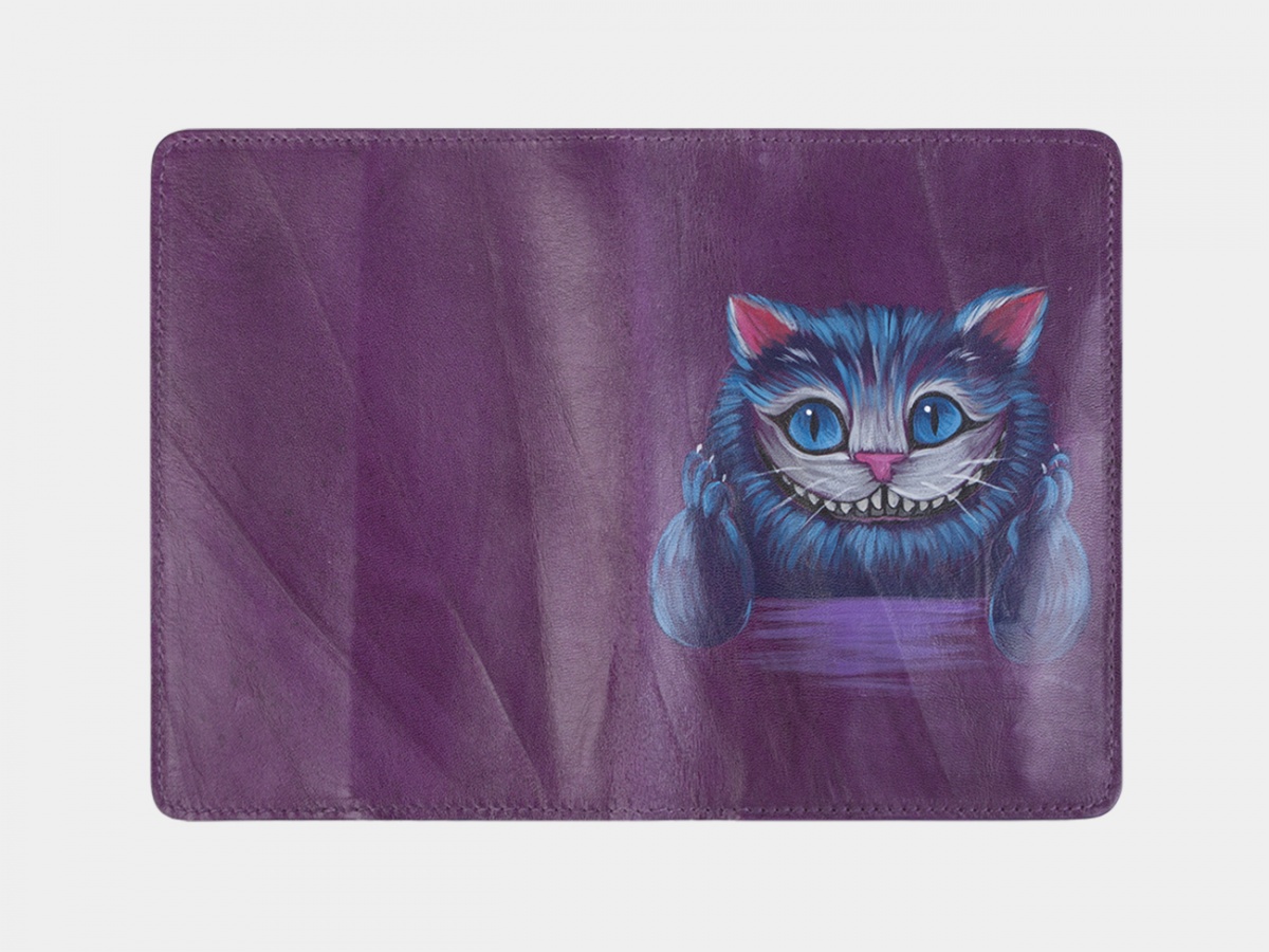 Фиолетовая обложка для паспорта "Чешир" с рисунком ручной работы на заказ | Купить