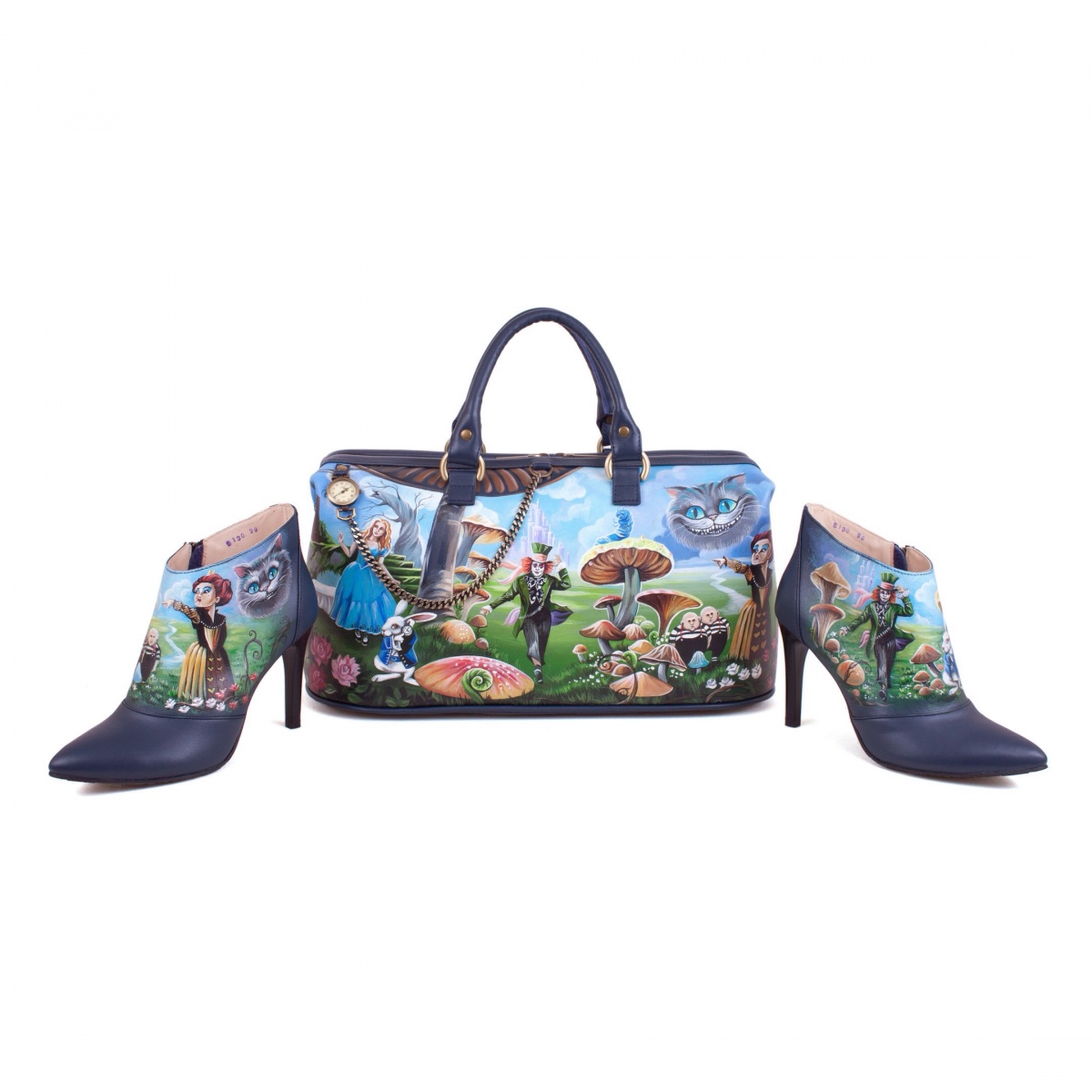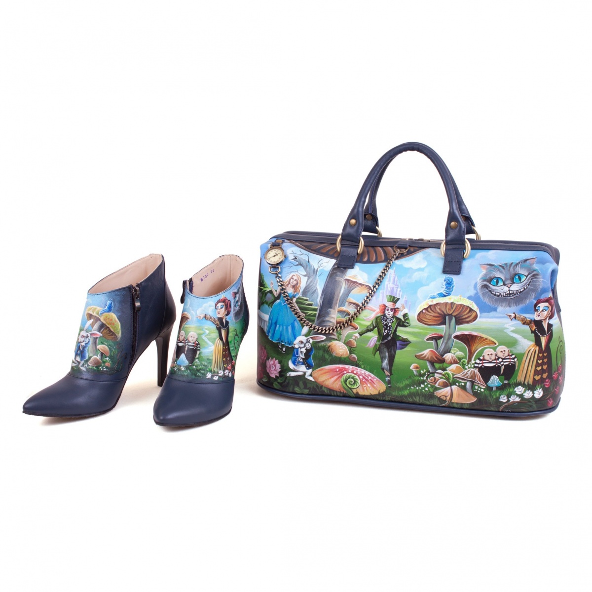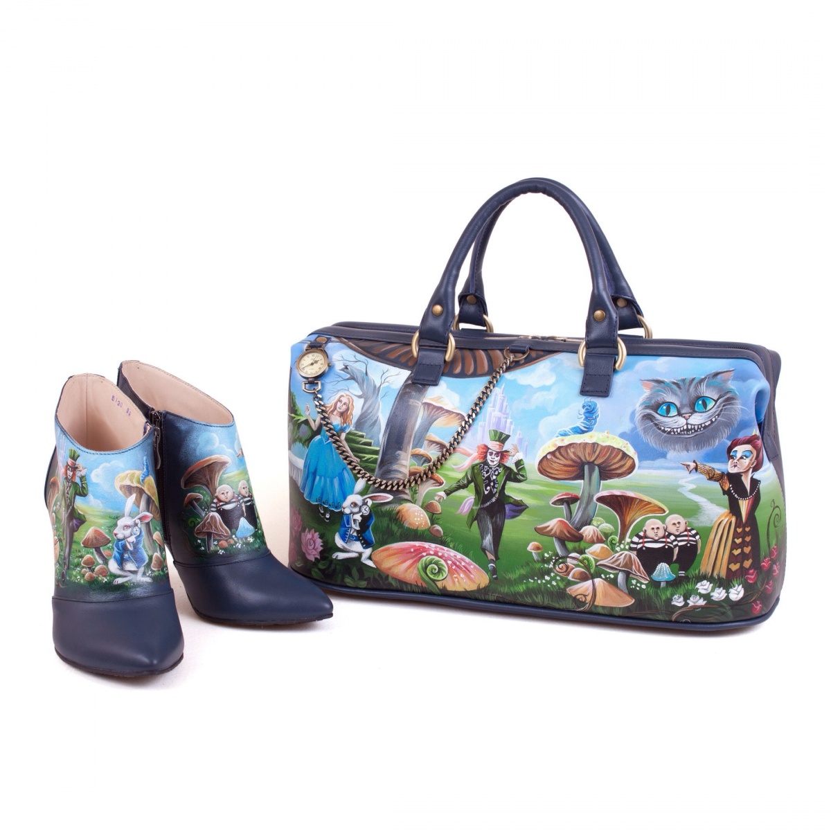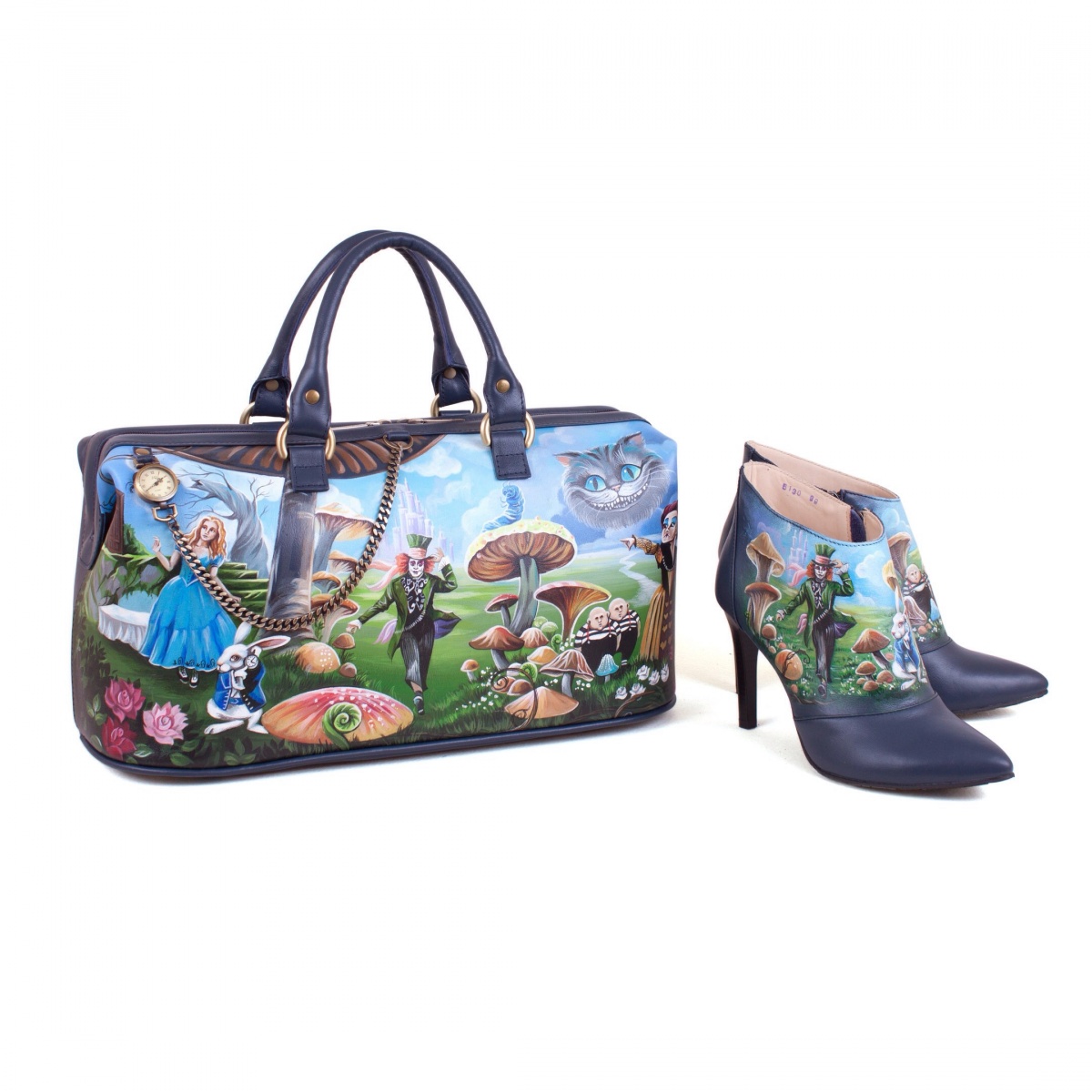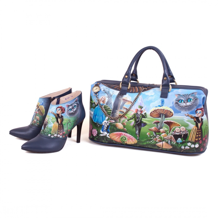 Комплект дорожный саквояж и ботильоны "Алиса" — набор сумка и туфли, рюкзак и сапоги с рисунком ручной работы | Купить в Sumnizza
