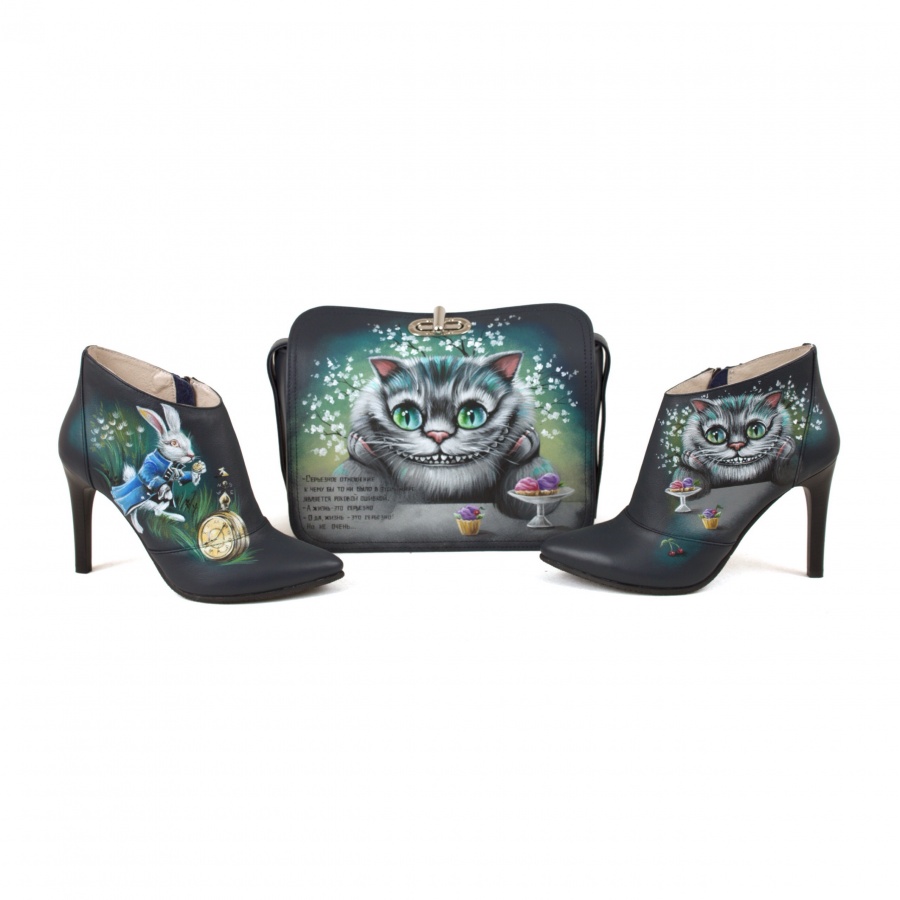 Комплект сумка с тремя отделениями и ботильоны "Чешир" — набор сумка и туфли, рюкзак и сапоги с рисунком ручной работы | Купить в Sumnizza