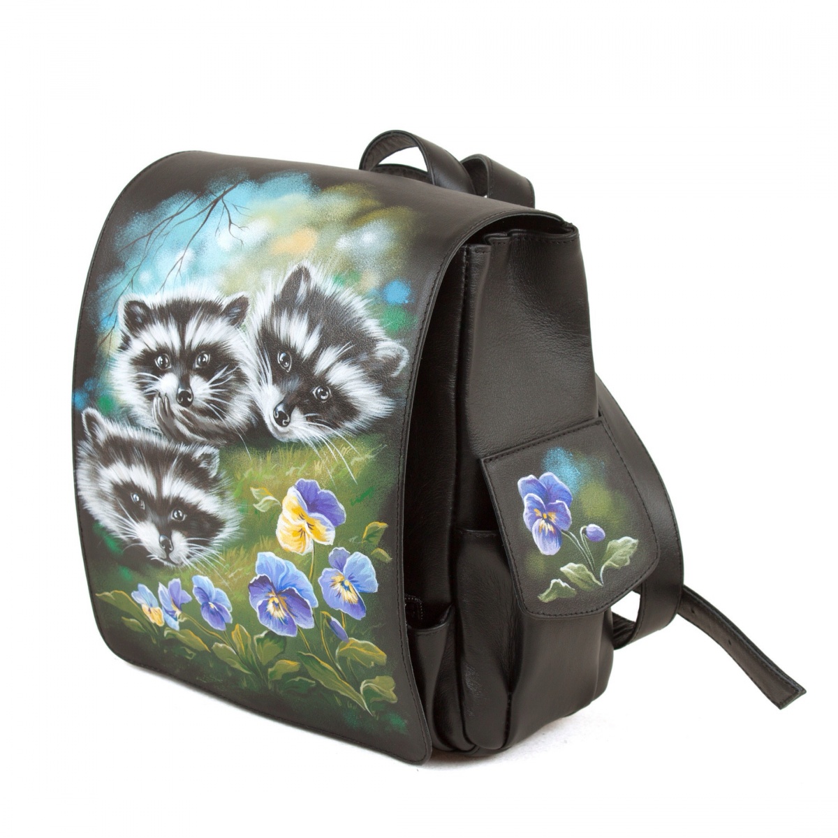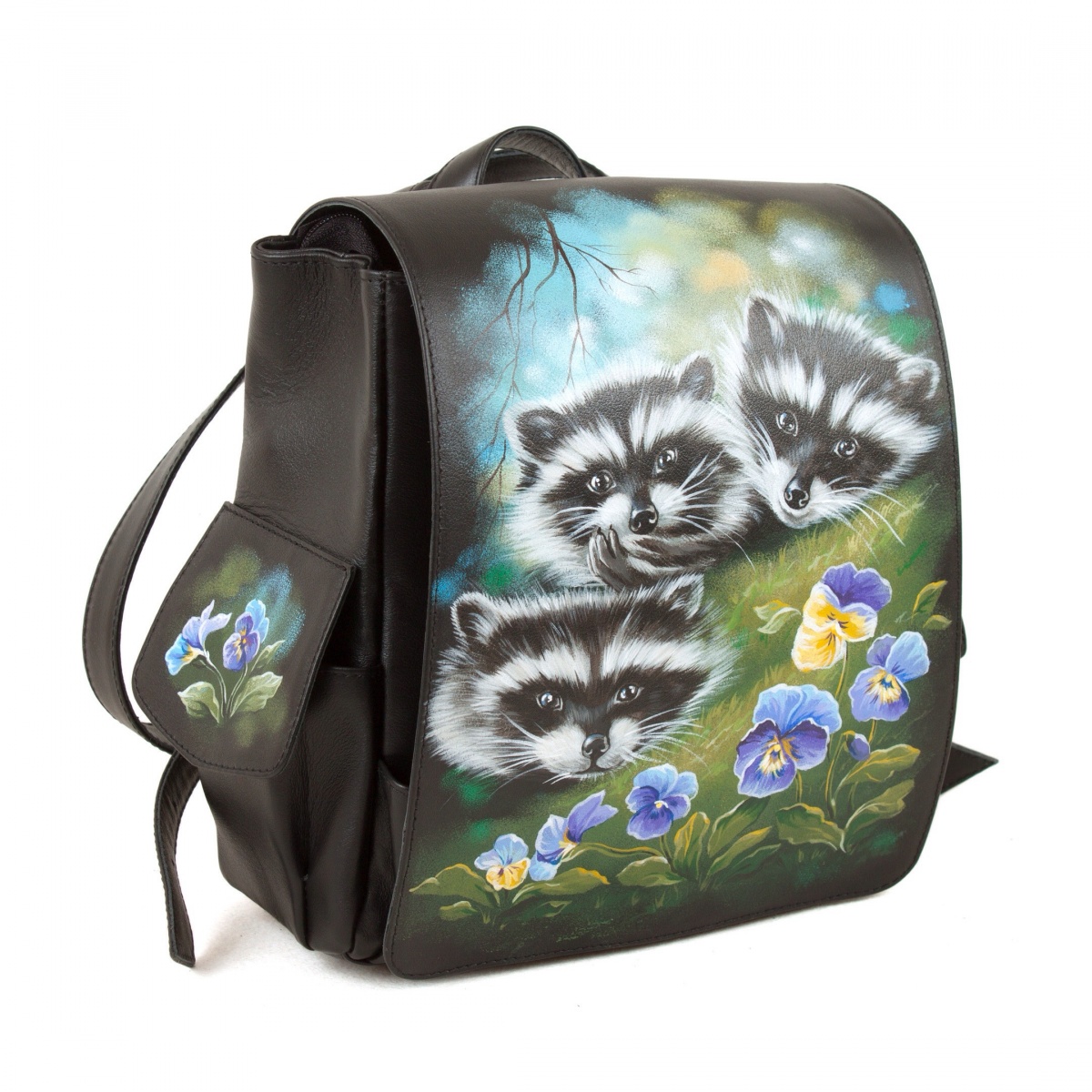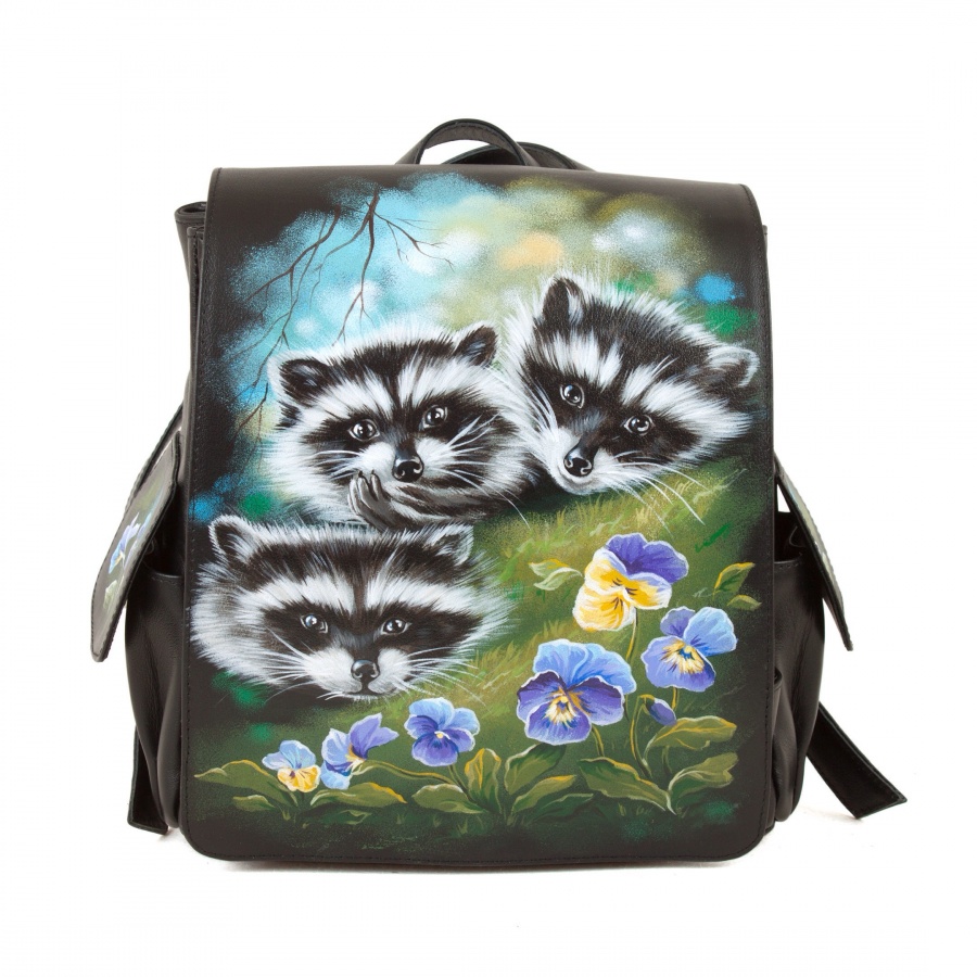 Черный женский рюкзак с карманами и рисунком "Добродушные еноты" ручной работы на заказ