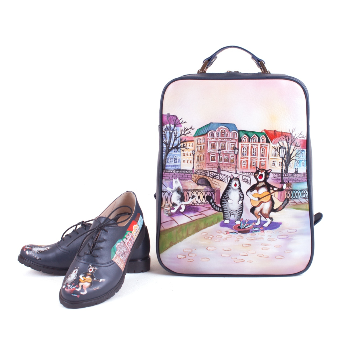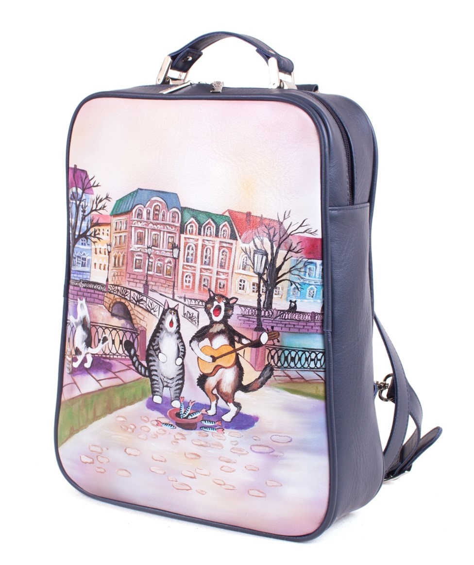 Кожаная сумка рюкзак "Коты артисты" ручной работы на заказ