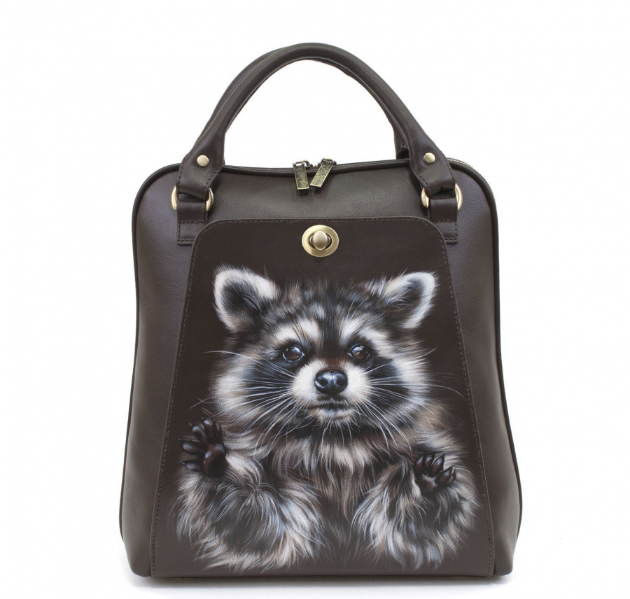 Кожаная сумка рюкзак с рисунком енотика "Пушистые лапки"