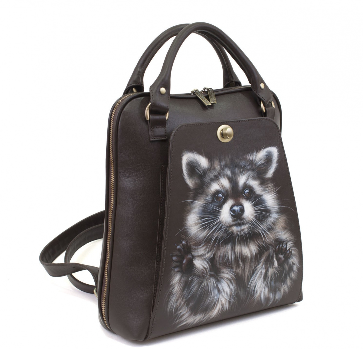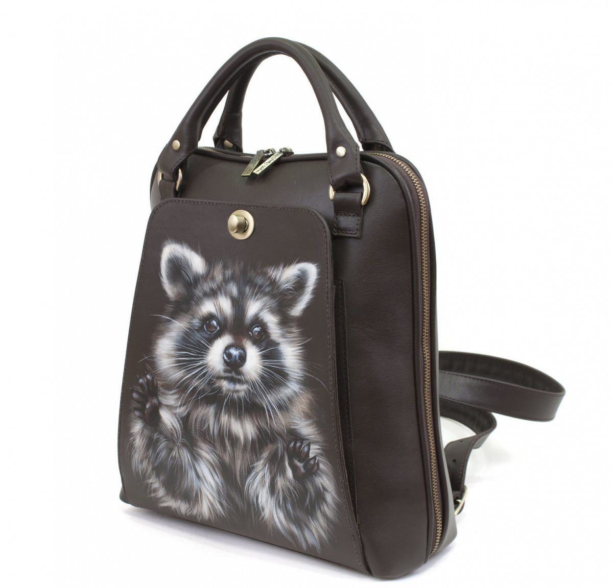 Купить Кожаная сумка рюкзак с рисунком енотика "Пушистые лапки" ручной работы на заказ