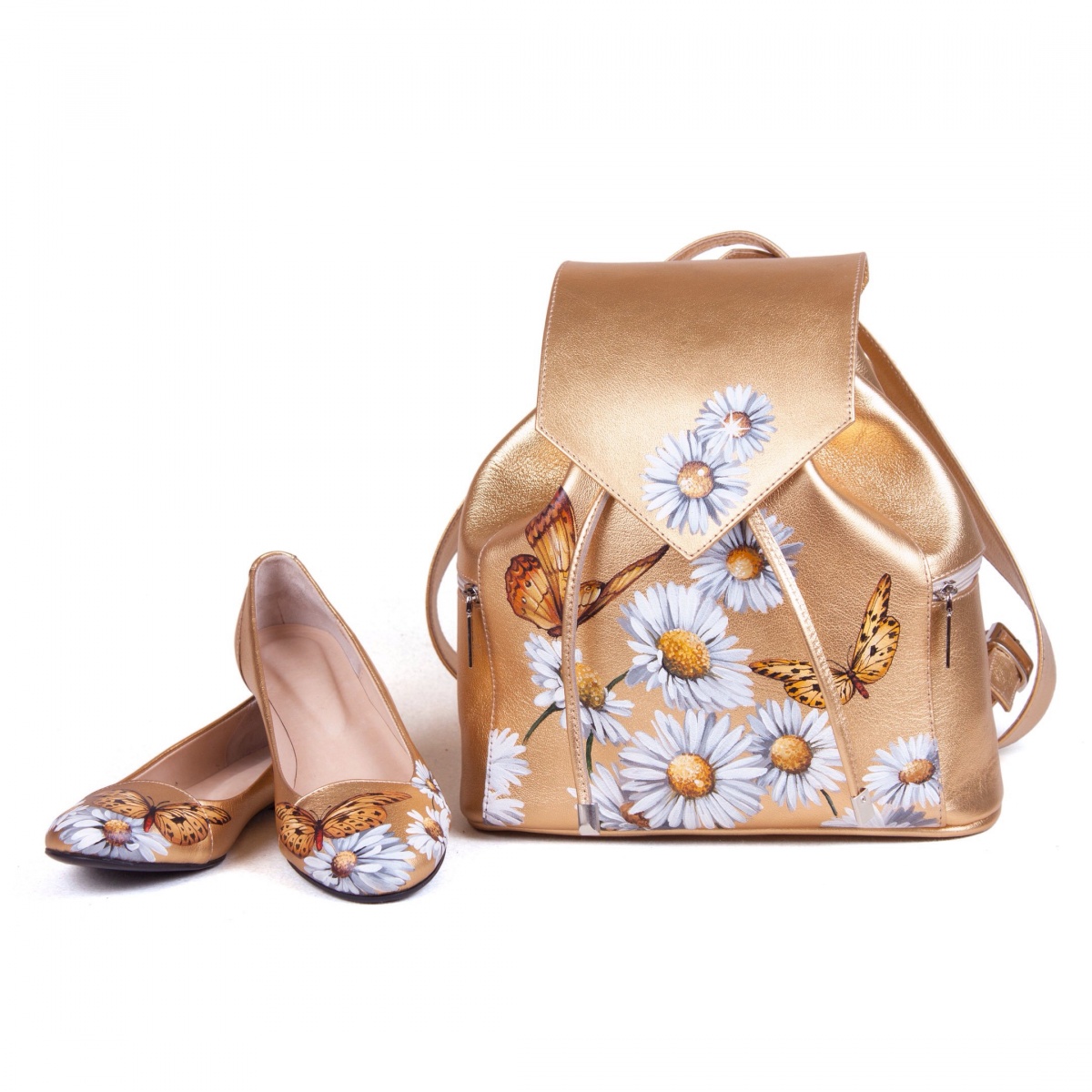 Балетки на заказ "Золотистые ромашки" - купить женские кожаные балетки с рисунком ручной работы - онлайн в Sumnizza