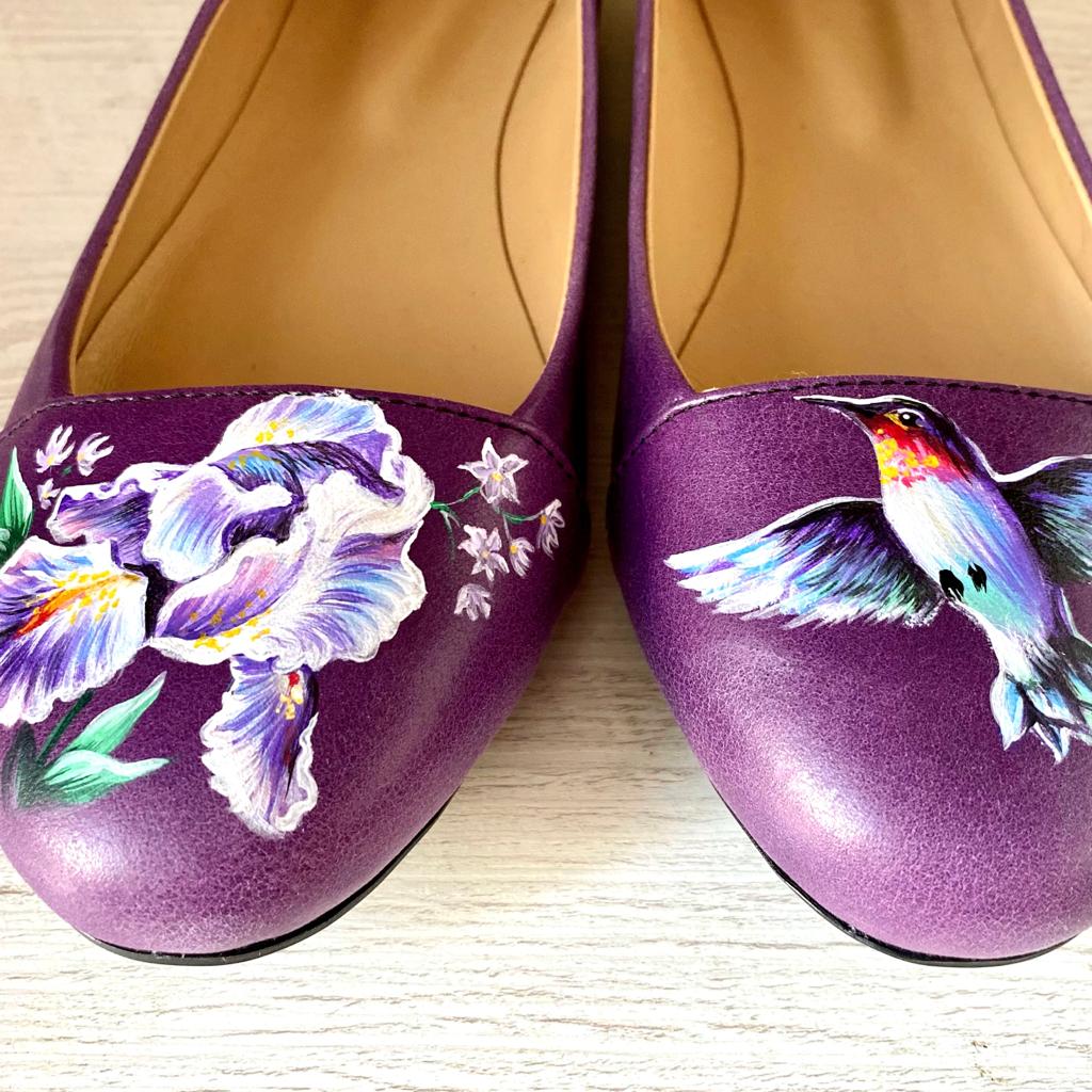 Цветные балетки "Ирис и колибри" - купить женские кожаные балетки с рисунком ручной работы - онлайн в Sumnizza