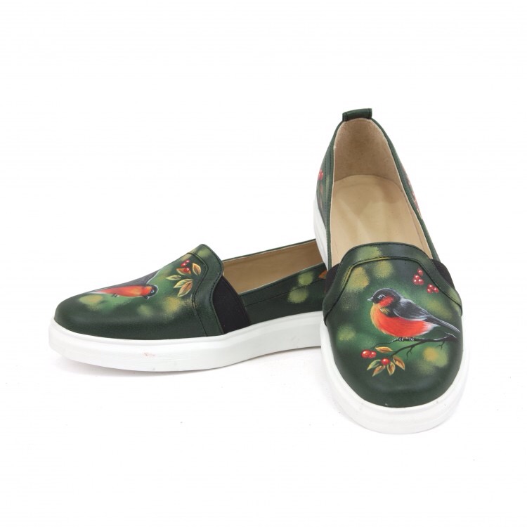 Купить Слипоны с белой подошвой с росписью "Красногрудые снегири" женские кожаные кеды и слипоны с рисунком ручной работы - он-лайн в Sumnizza