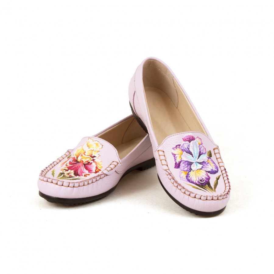 Мокасины с росписью ручной работы "Ирисы" - купить женские кожаные и замшевые мокасины с рисунком ручной работы - он-лайн в Sumnizza