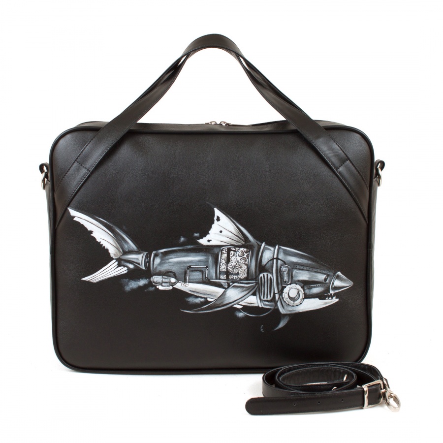 Сумка с отделением для ноутбука "Стимпанк акула" ручной работы с рисунком на заказ