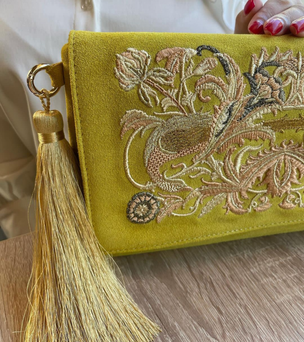 Уникальная замшевая женская сумка клатч ручной работы с вышивкой и шелковой кистью