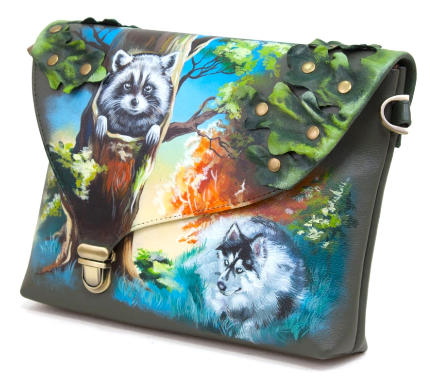 Женский кожаный клатч с портретной росписью и аппликацией "Енот и Хаски" на заказ - женская кожаная сумка ручной работы с авторским рисунком фото 4