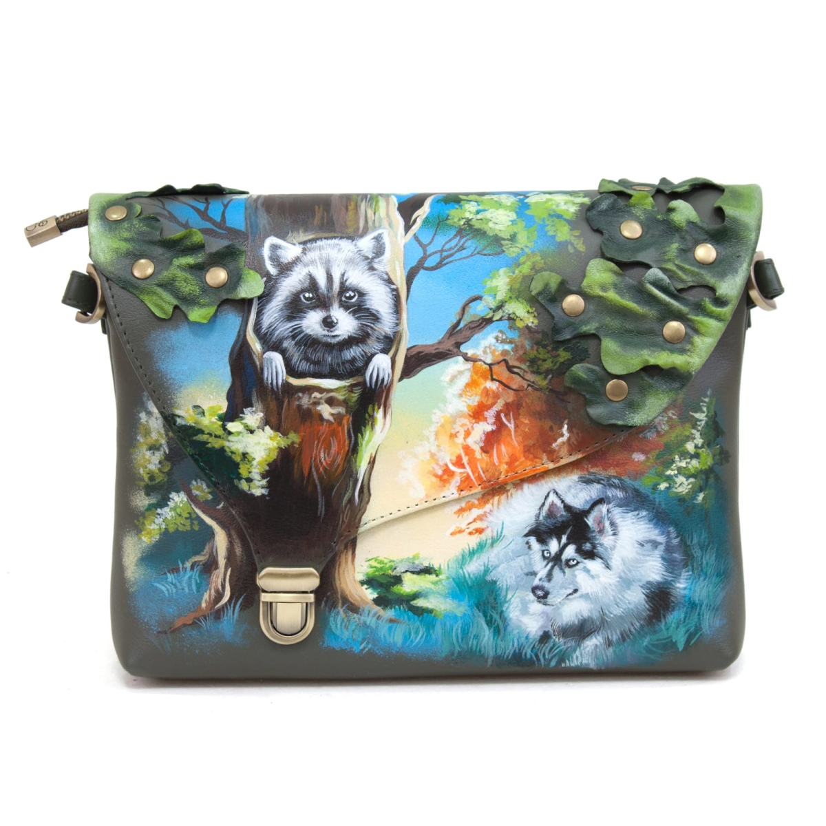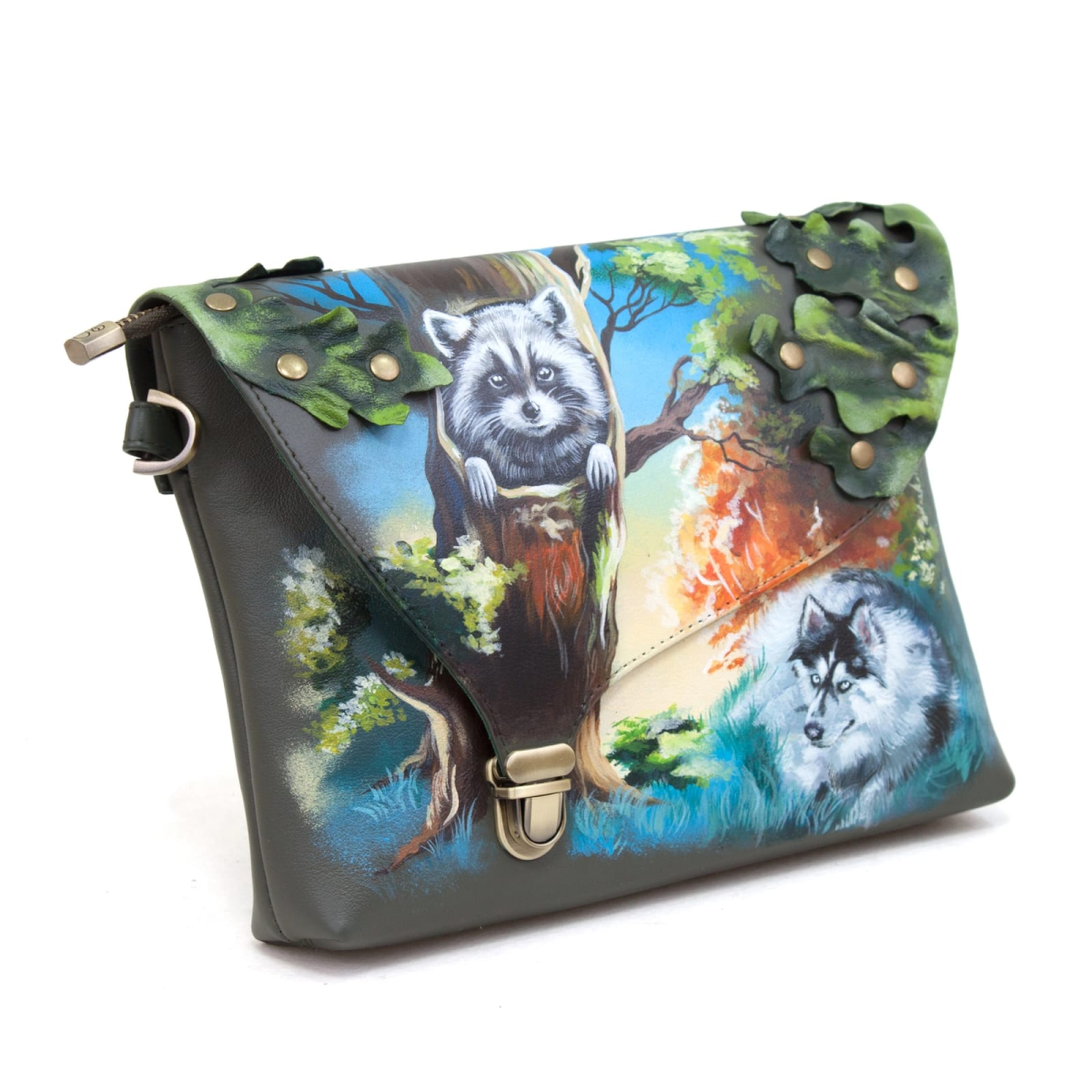 Женский кожаный клатч с портретной росписью и аппликацией "Енот и Хаски" на заказ - женская кожаная сумка ручной работы с авторским рисунком