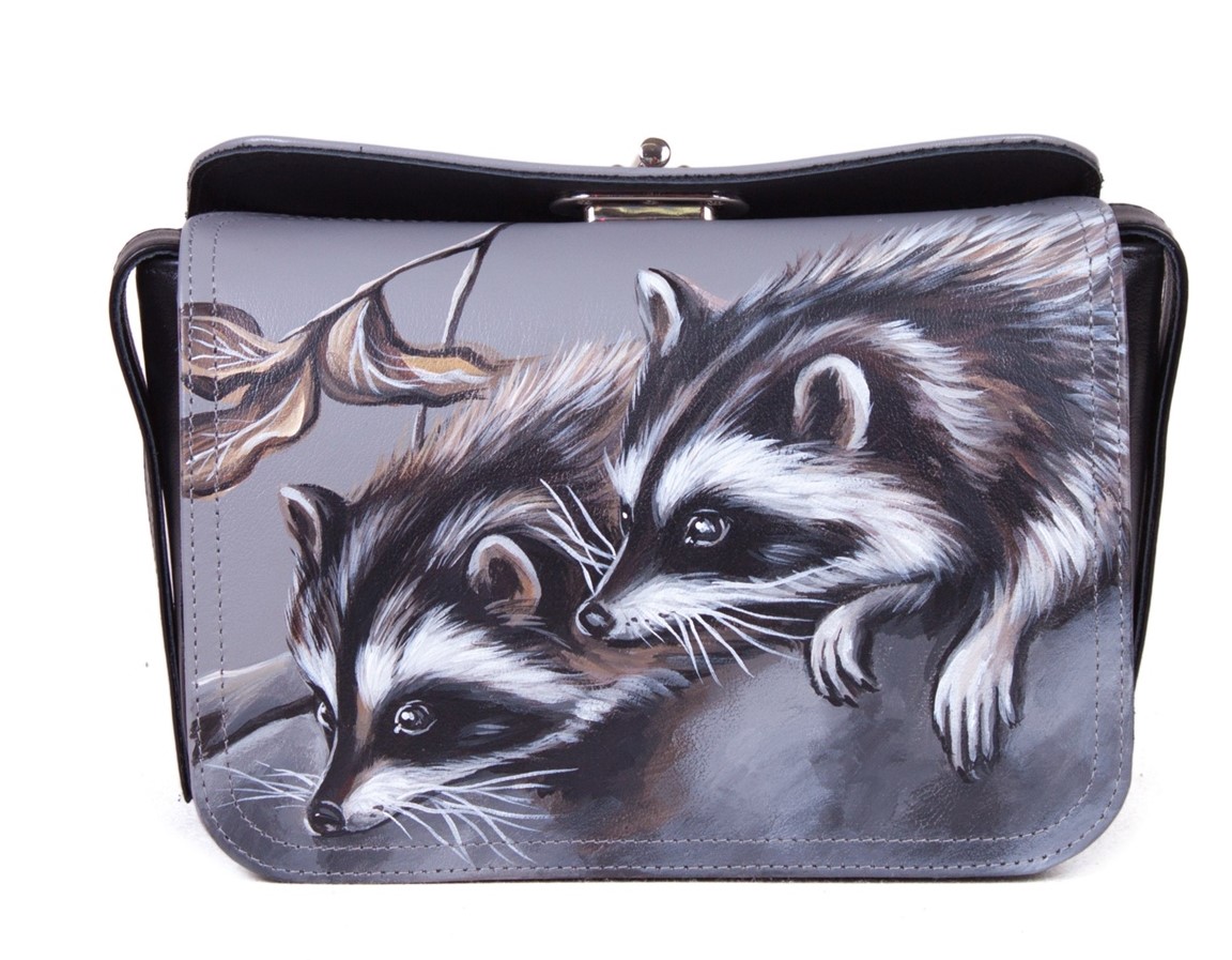Женская кожаная сумка через плечо с рисунком ручной работы "Еноты"