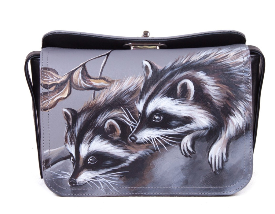 Женская кожаная сумка через плечо с рисунком ручной работы "Еноты" на заказ | Купить в Sumnizza