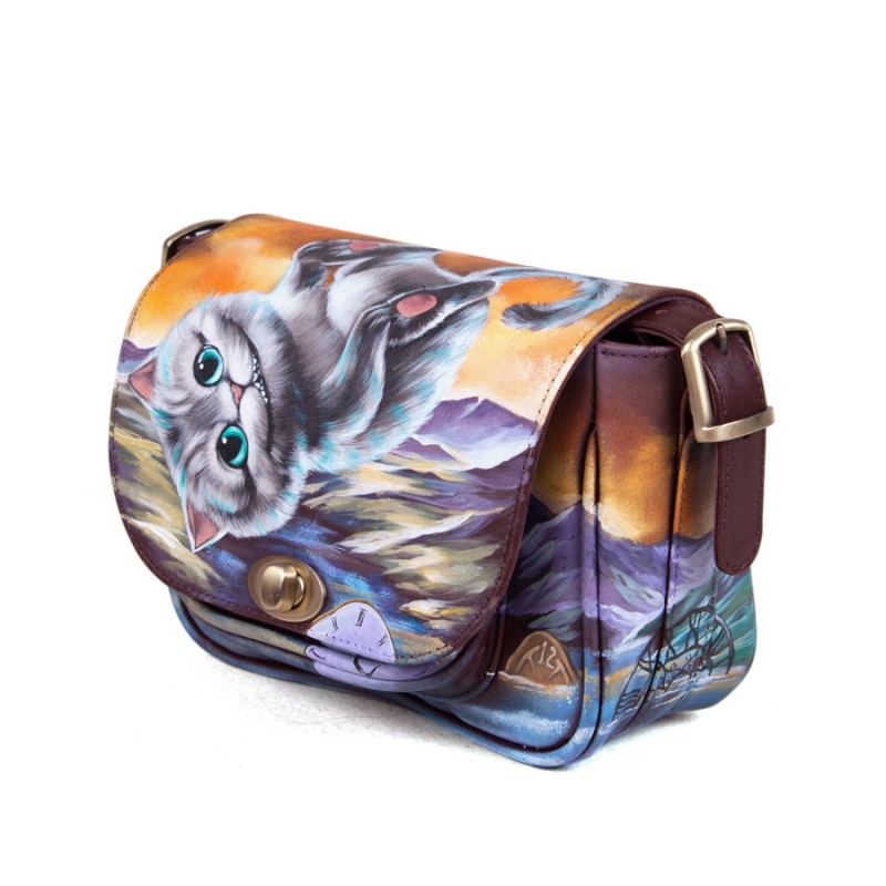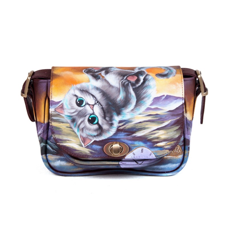 Женская кожаная сумка через плечо с рисунком ручной работы "Время Чеширского кота"