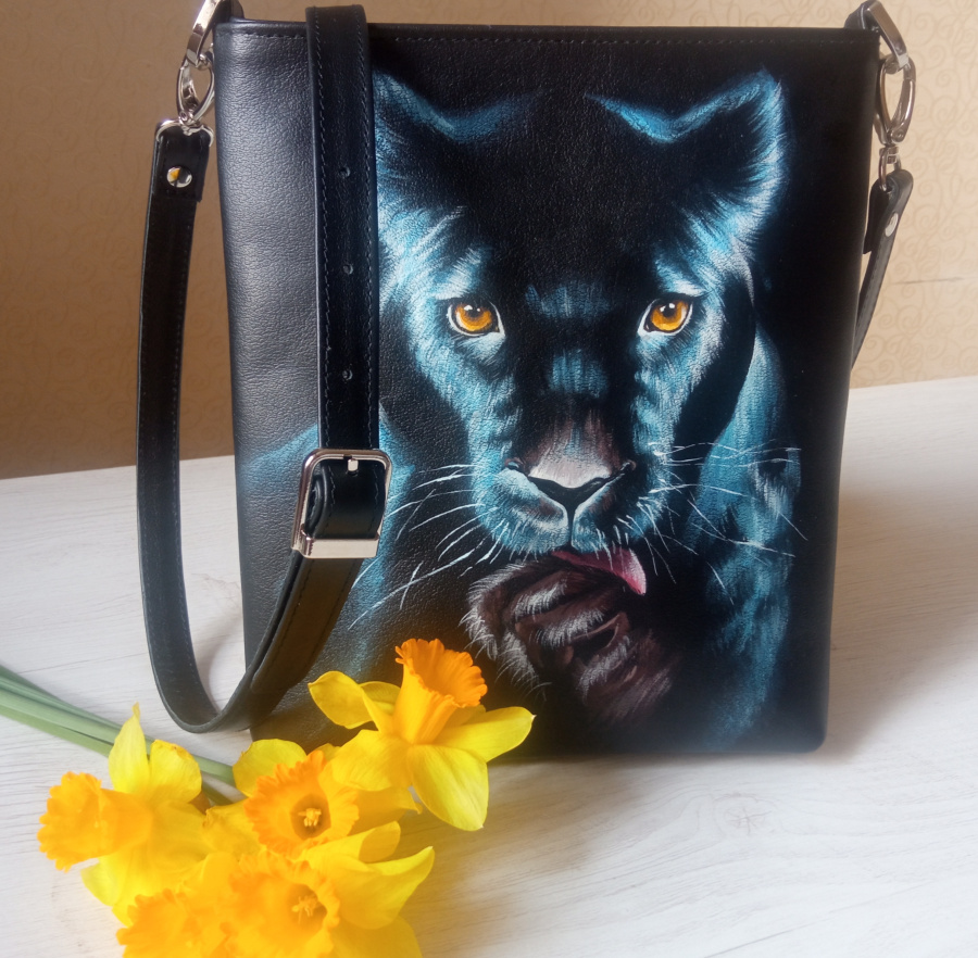 Женская кожаная сумка через плечо с рисунком ручной работы "Черная пантера" — кросс боди с принтом на заказ фото 5