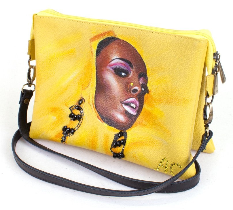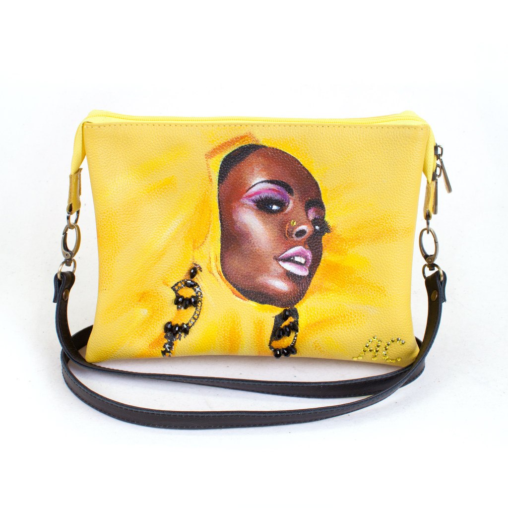 Женская кожаная сумка через плечо с рисунком ручной работы "Афро-девушка в желтом" на заказ | Купить в Sumnizza