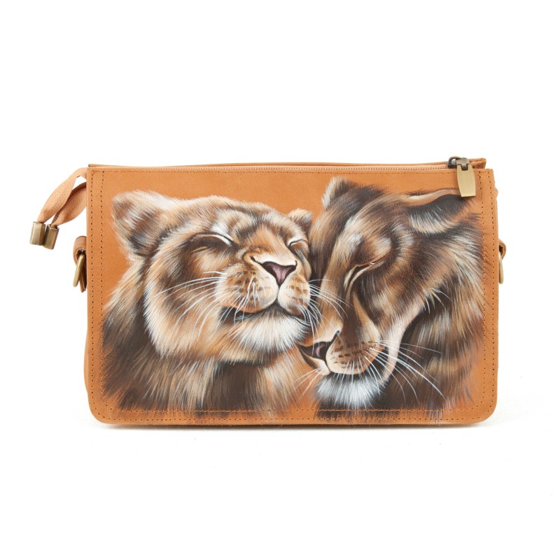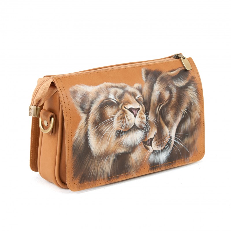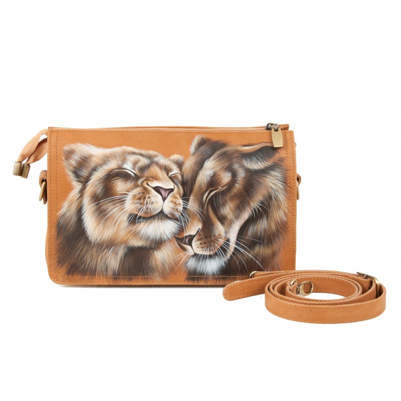 Женская кожаная сумка через плечо с рисунком ручной работы "Львиная нежность"
