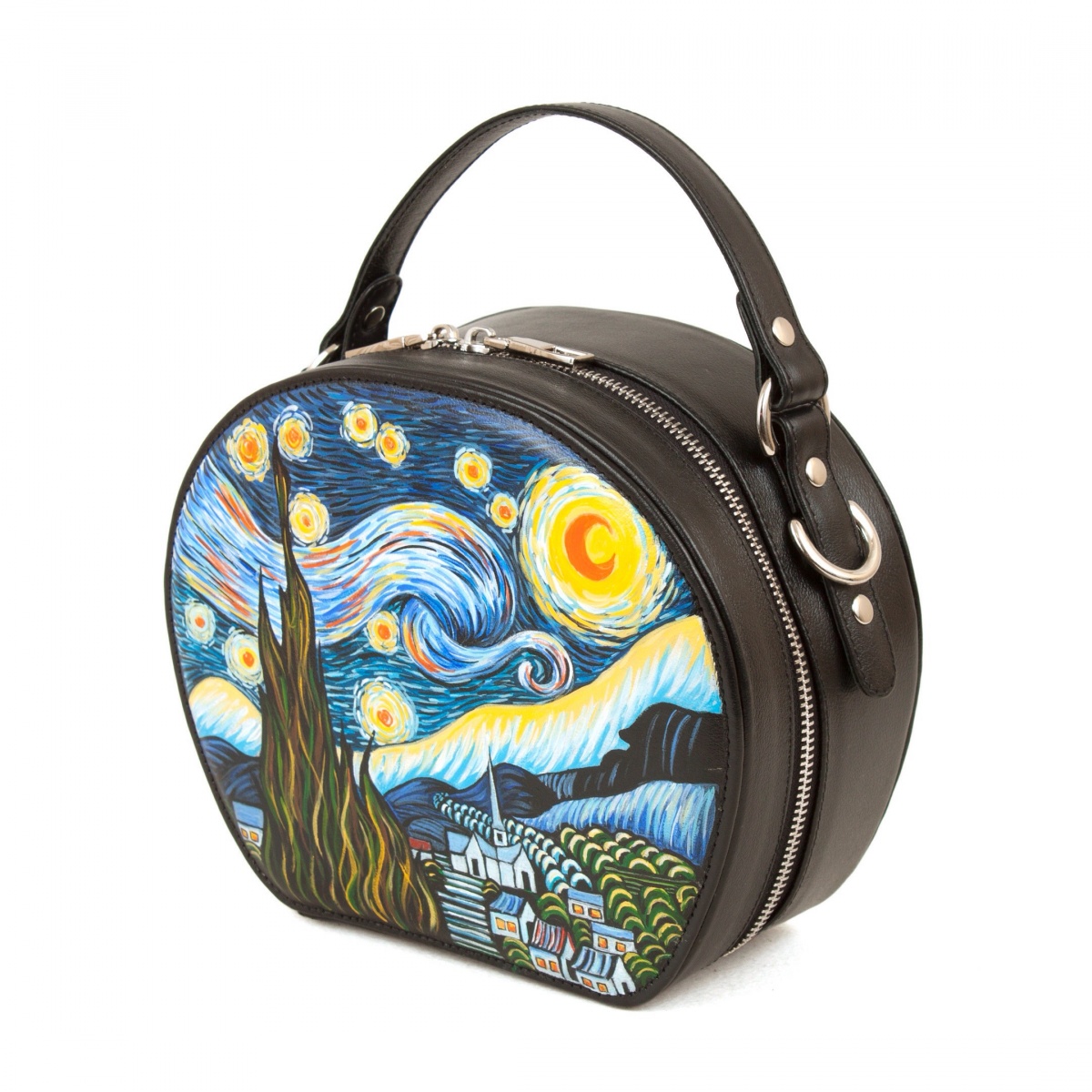 Хотите купить женскую кожаную круглую сумку с уникальной росписью ручной работы? Мы создадим ее специально для вас!
