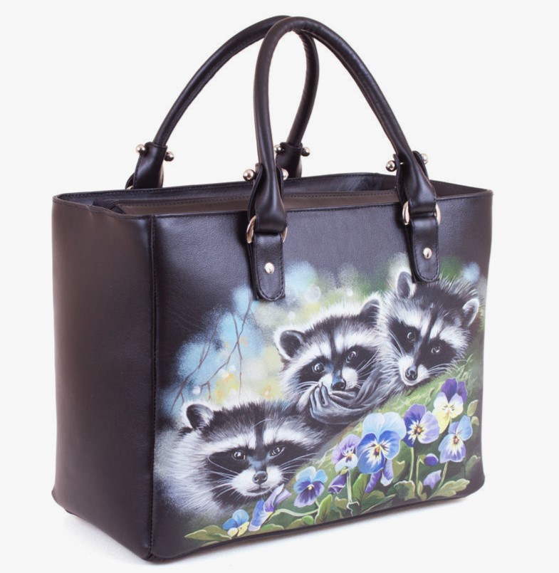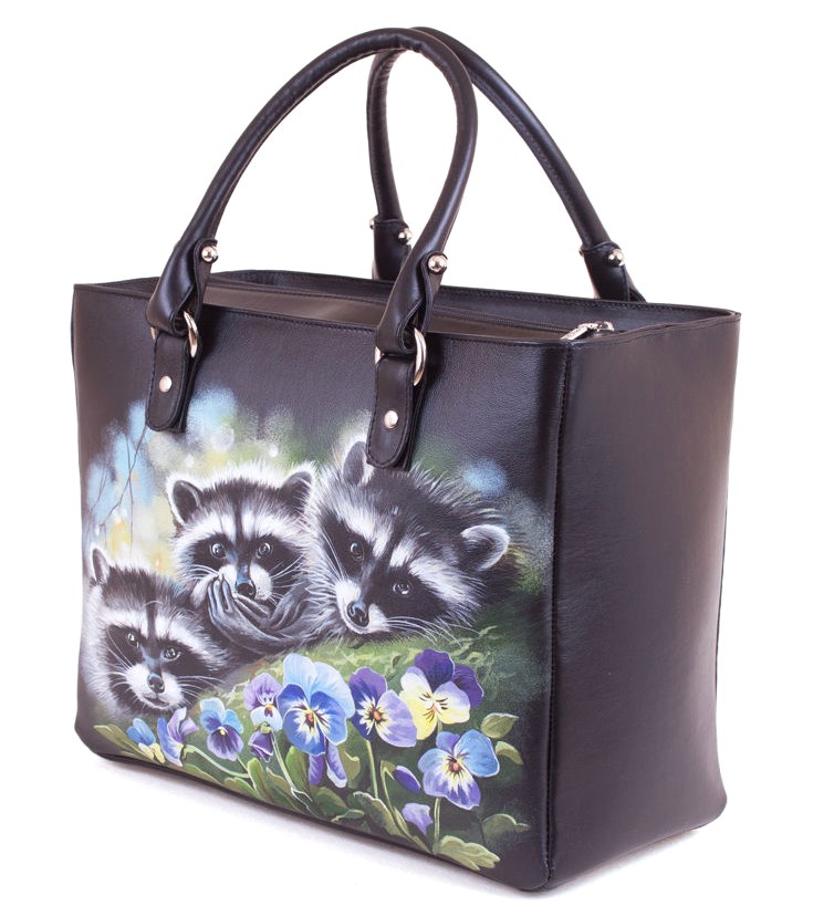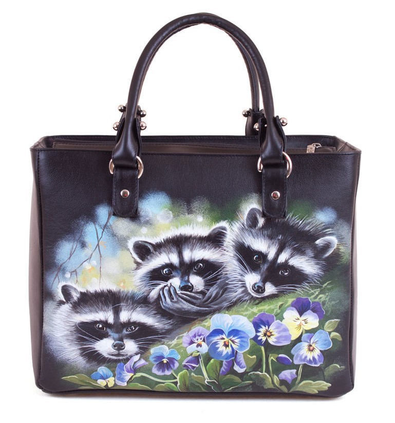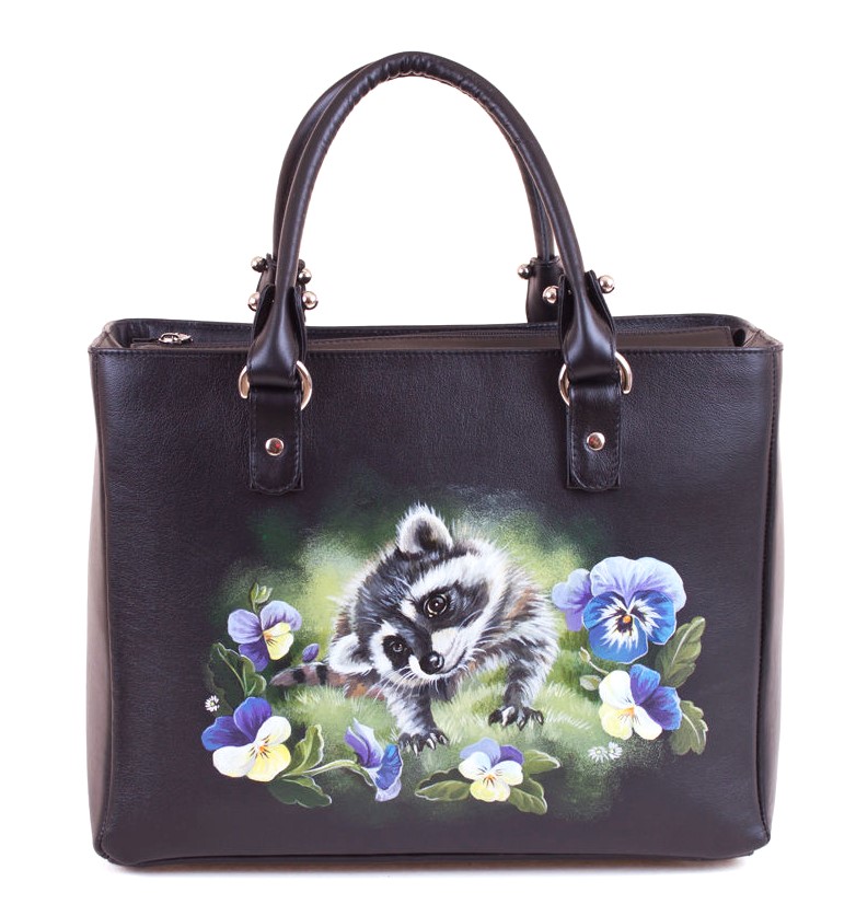 Кожаная сумка шоппер с росписью "Еноты в анютиных глазках"
