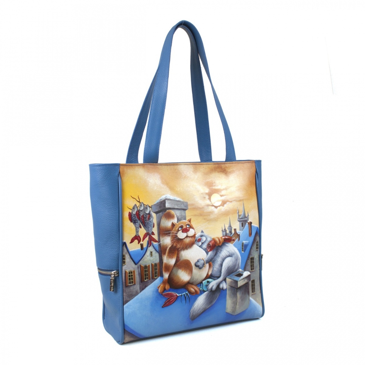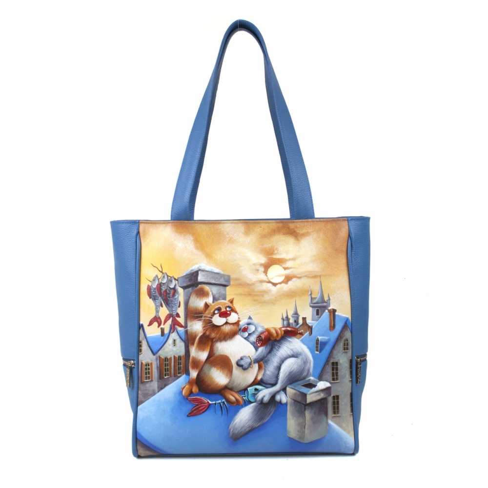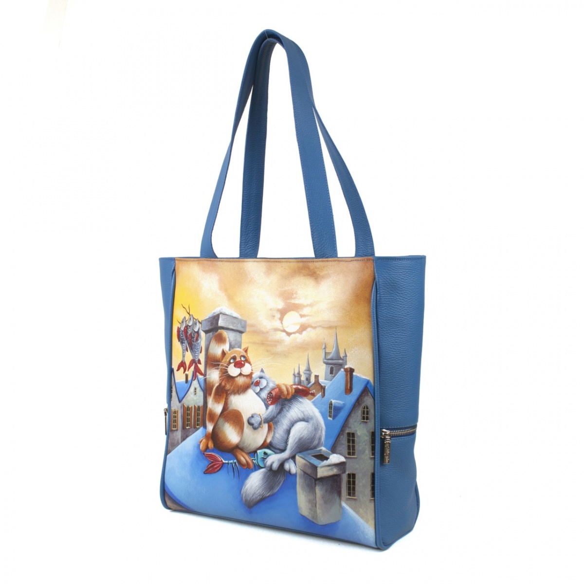 Женская сумка шоппер с росписью "Питерские коты" - кожаная и замшевая женская сумка шоппер ручной работы с рисунком и вышивкой на заказ